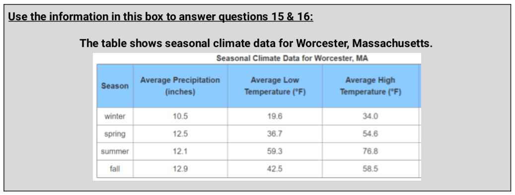 Identify the season when the greatest amount of water moves from Earth’s surface into the atmosphere in Worcester. Explain why this season has the greatest amount of water moving into the atmosphere. Include data from the seasonal climate table and describe the role of energy to support your answer. (7 pts)