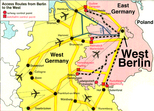 The Berlin Wall was a physical barrier that separated West Berlin from East Berlin and the rest of East Germany until the East German government relaxed border controls on November 9, 1989, amid massive prodemocracy demonstrations as a flood of refugees fled East Germany for the West via Czechoslovakia. The wall was a 13-foot concrete barrier that snaked through Berlin, effectively sealing off West Berlin from ground access except on terms acceptable to the East German government. More than 23,400 East Germans fled to the West across the Wall, although hundreds died trying to escape across it.