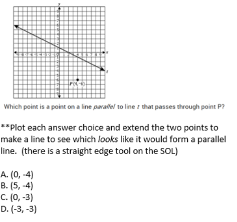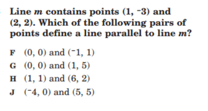 Remember that slopes of parallel lines are the SAME. So (1) find the slope of the line given the points in the question (2) find the slope of the line of each answer. The one that matches will be your answer.