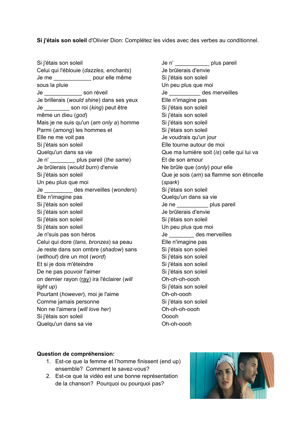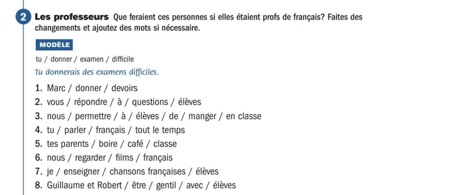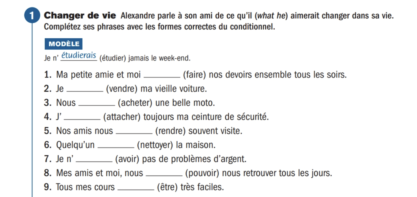 Après plusieurs années à une petite école, j' (1) _______ mon C.V. (resumé) à Flint Hill School et je (2) _______ prof de français. J' (3) _______ un très bon salaire, peut-être $1.000.000 par an. J' (4) _______ un bon assistant qui ferait tout le travail que je ne veux pas faire. Nous (5)_______ des leçons ensemble et nous (6) _______souvent à Paris. Les élèves me _______ à Madame Goldstein parce que je serais plus cool.