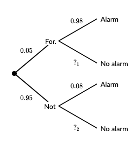 The chance that the alarm is triggered depends on whether or not the bag contains a forbidden item, so we should first distinguish between bags that contain a forbidden item and those that don't.