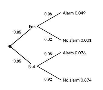Use the Tree Diagram above. What is the probability that a bag without a forbidden item will NOT sound the alarm?