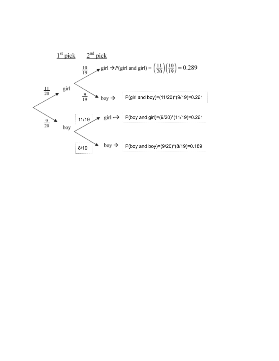 Give the probability (in decimal form rounded to three places) that a boy is chosen first and a boy is chosen second: