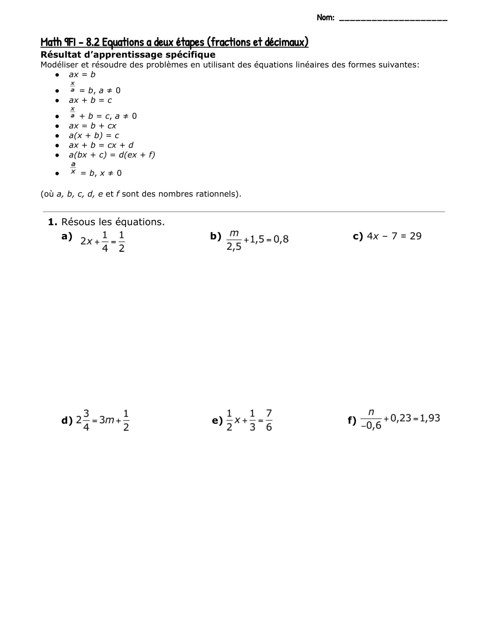 Math 9FI - 8.2 - Algèbre - Equantions à 2-étapes