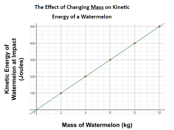 Aniya collected data from dropping watermelons of different mass from the same height and studying the amount of kinetic energy in the splat. Below are her data table and graph.
