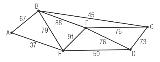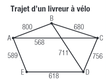 Chaque sommet ci-contre représente un client d'un livreur à vélo et chaque arête, la distance (en m) qui sépare deux clients. À partir du client A, quel est le trajet permettant de visiter chacun des clients une seule fois et de revenir au point de départ?