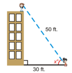 Molly sees her friend Elise standing on top of a building 50 feet away from her. If Molly is 30 feet away from the base of the building, what is the angle of elevation from Molly to Elise?