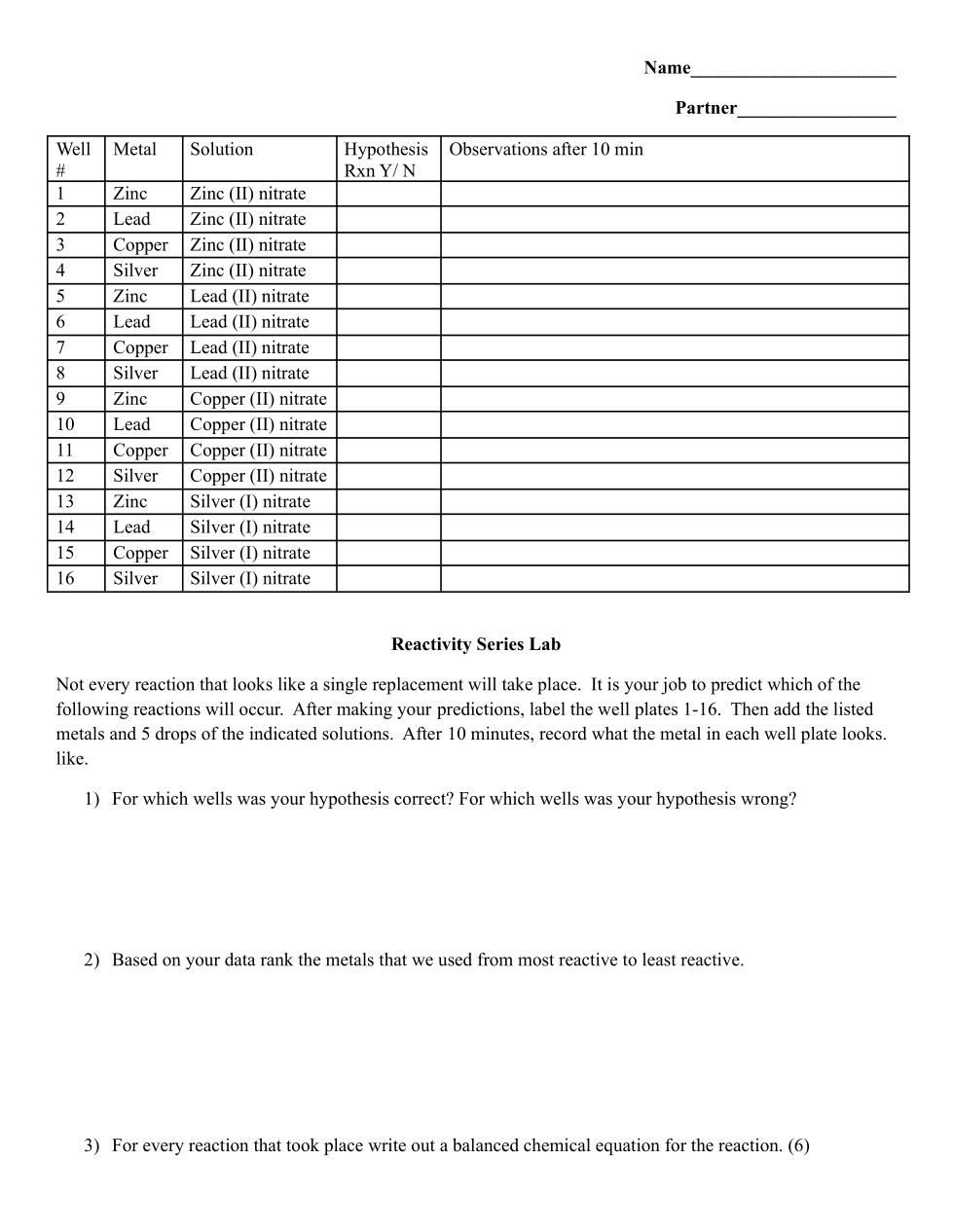 Reactivity Series Lab