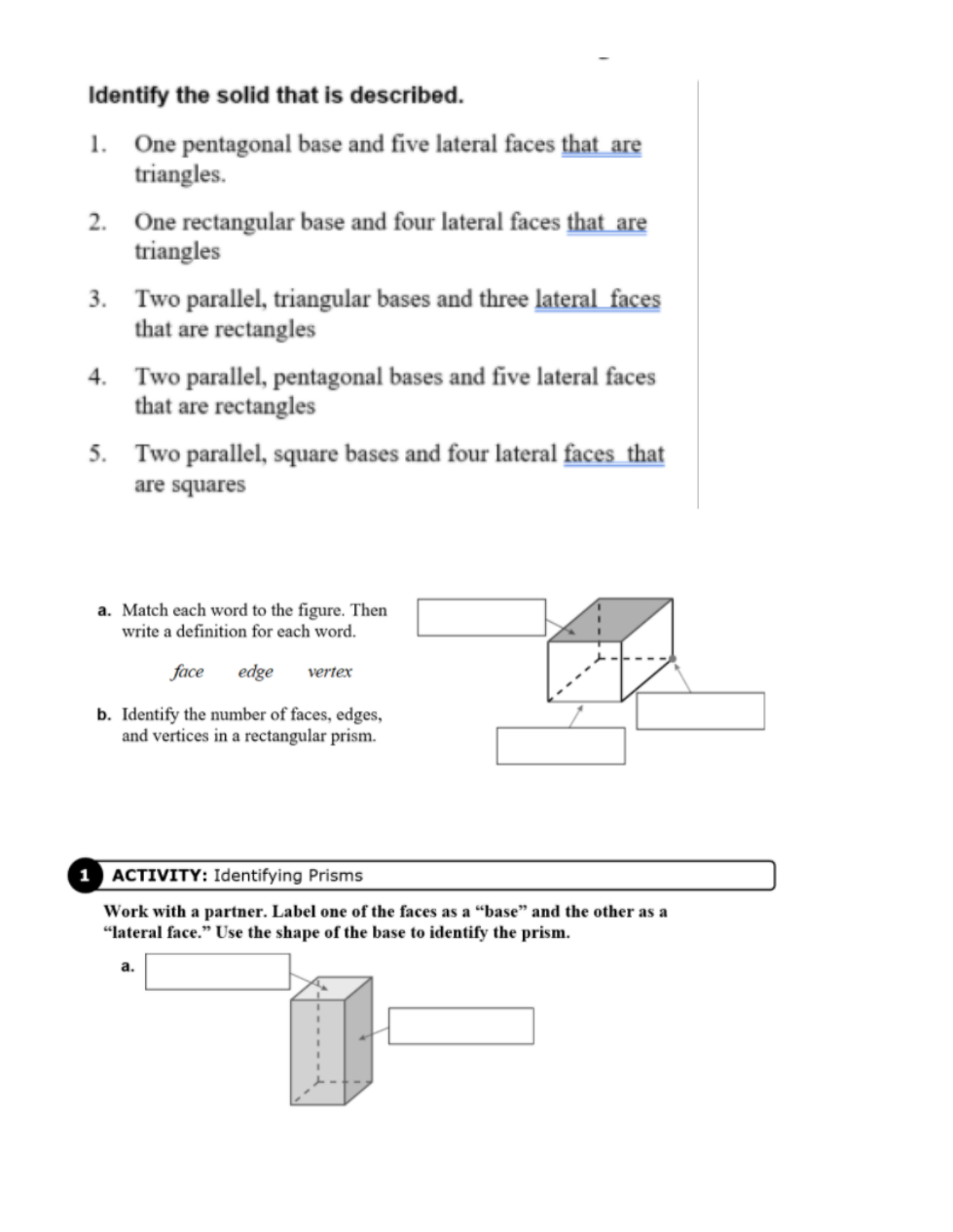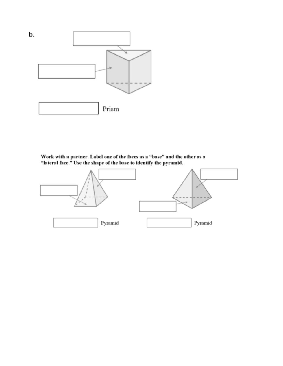 Provide the name: shape of base and prism or pyramid. (no capital letters, spelling counts so use the question for correct spelling reference)
