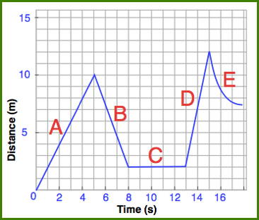 This shows a dog's distance from his house in meters over 18 seconds. Move the descriptions to match what is happening at each time period (A/B/C/D/E labels below).