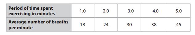 In an investigation a student exercises for different periods of time while counting the number of breaths she takes per minute. The table shows the average (mean) number of breaths per minute for each period of time exercising.