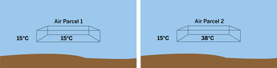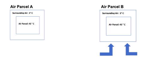 Two air parcels started with the same air temperature and are surrounded by colder air.
