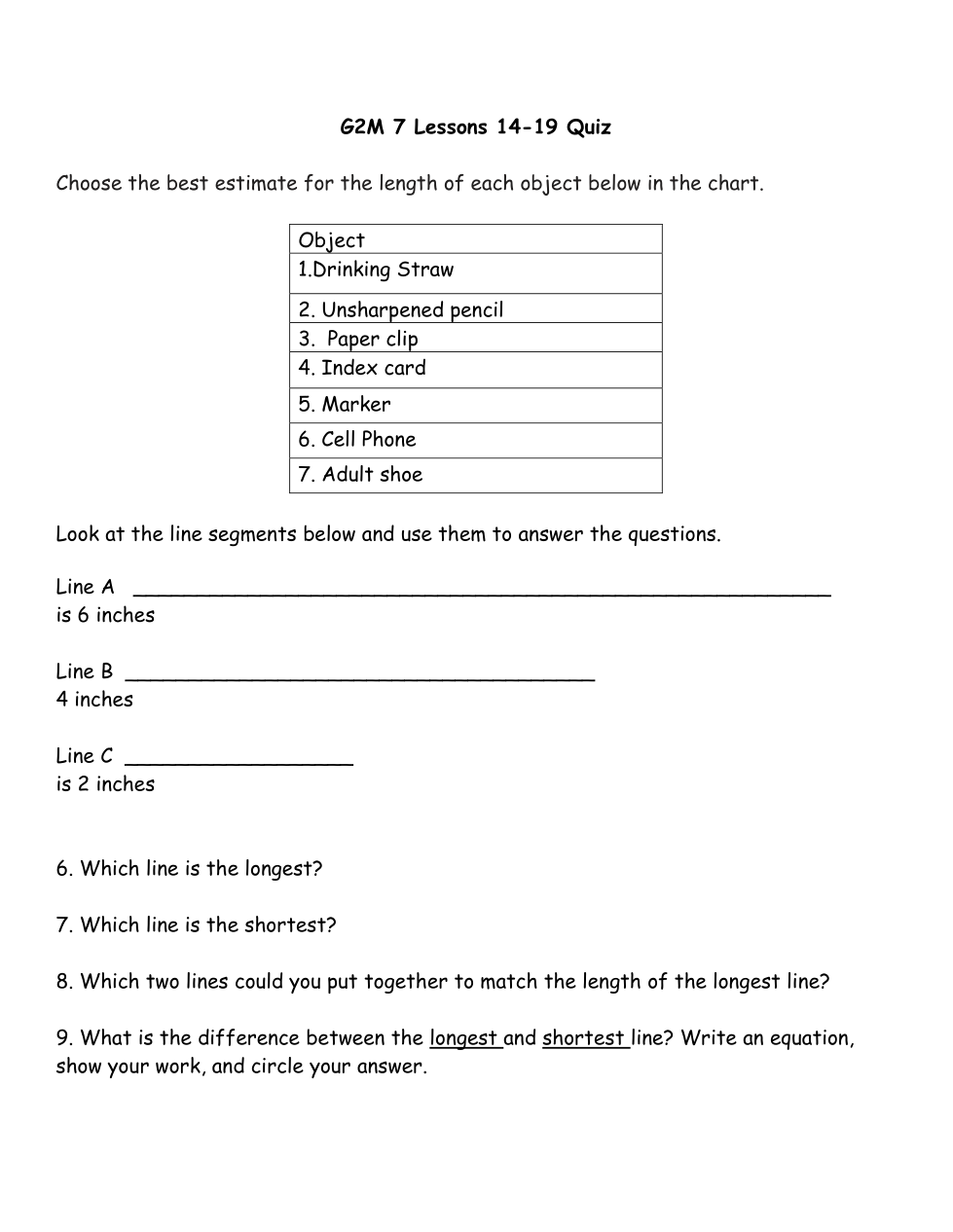 What is the difference between the longest and the shortest line? Write an equation, show your work, and circle your answer.