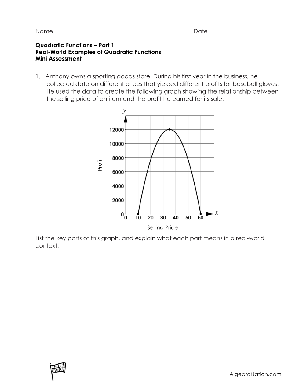 1) x-intercepts: ( ) and ( )2) He started to make a profit at $( ) selling price.3) At the maximum ( ) the most profit is generated.4) At the selling price $( ) a profit is no longer made.