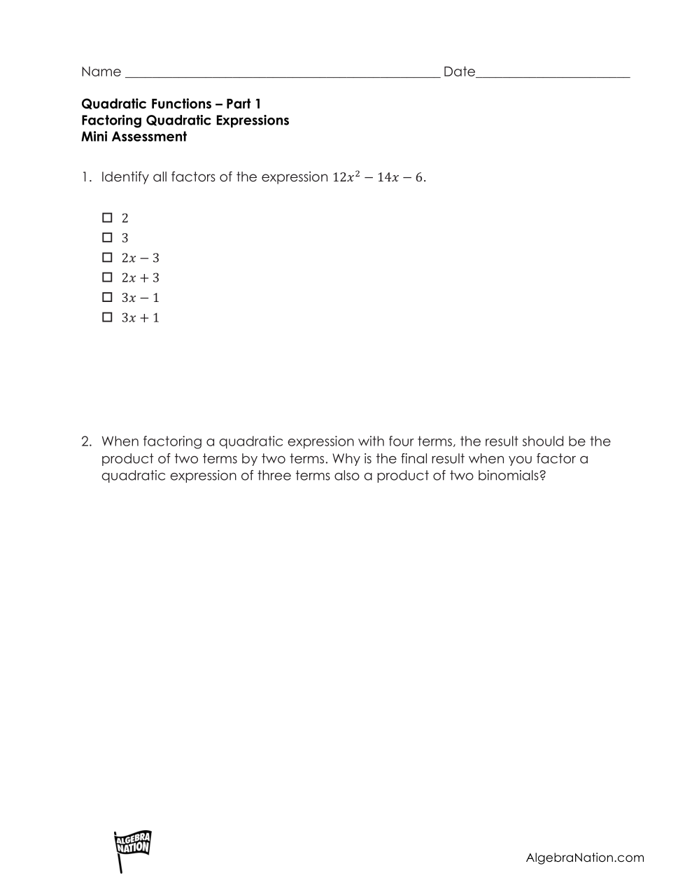 Identify the FACTORS. HINT: Check if you can simplify the equation first.HINT2: Multiply your factors to check if they are correct.HINT3: THERE ARE 3