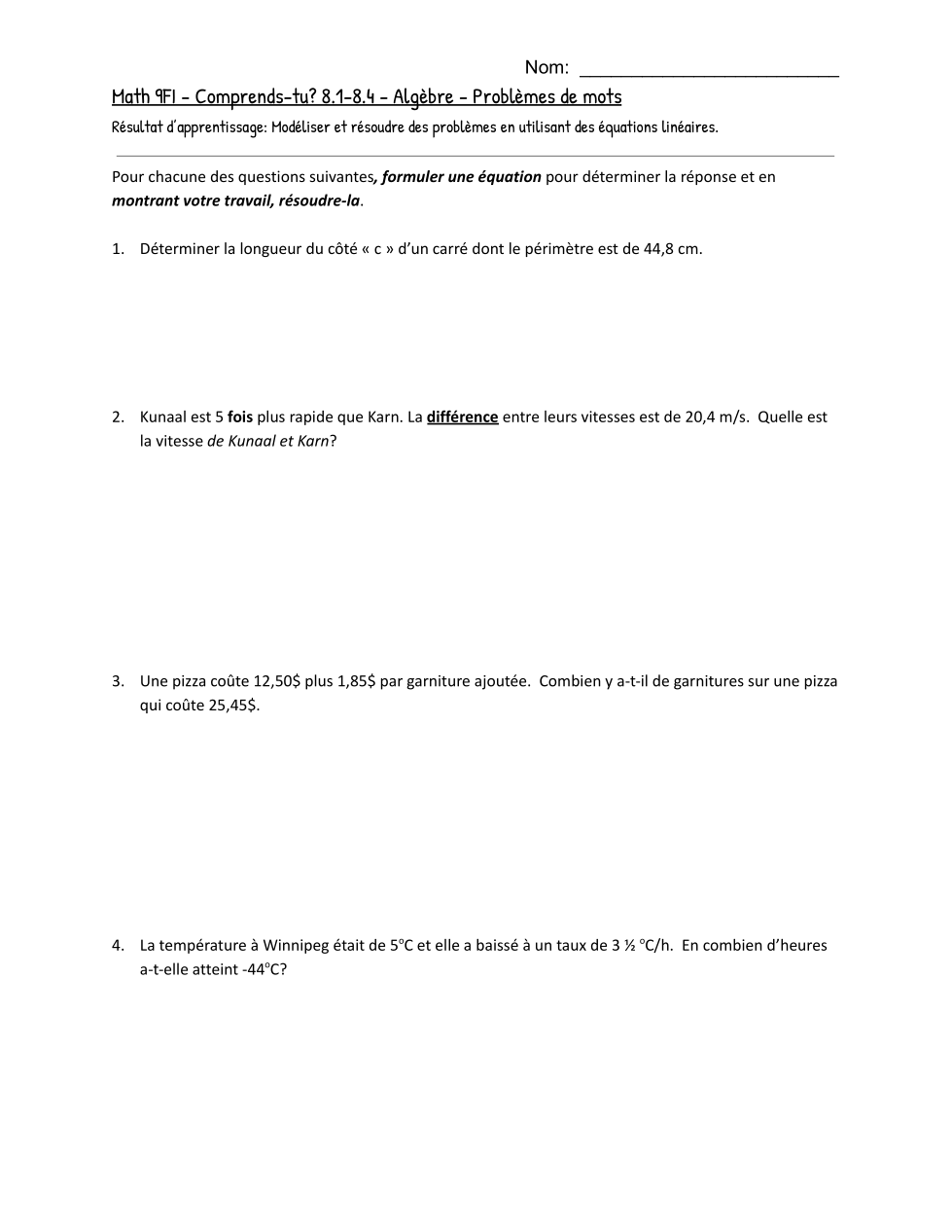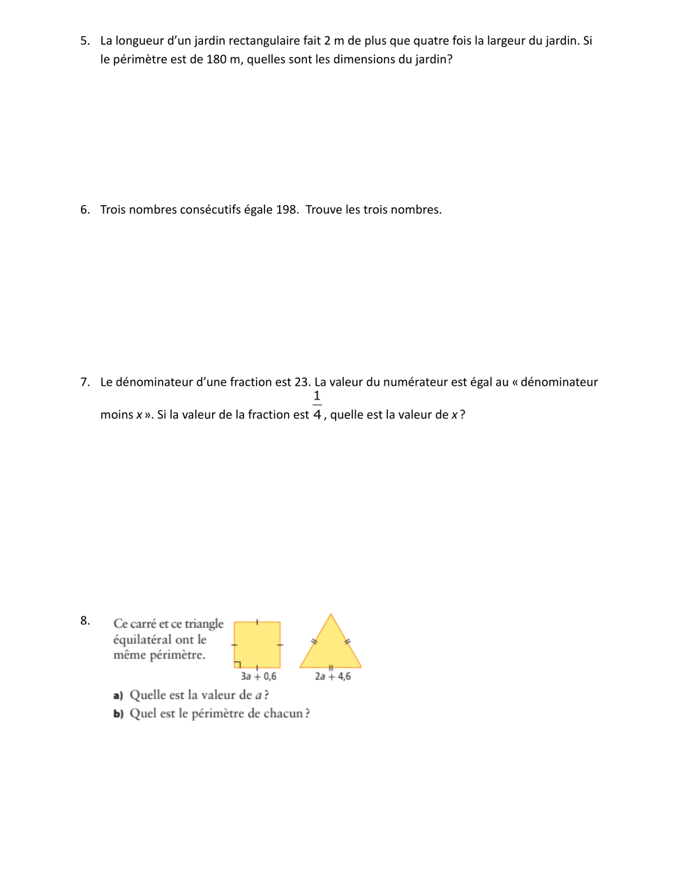 Modéliser et résoudre des problèmes en utilisant des équations linéaires des formes suivantes: