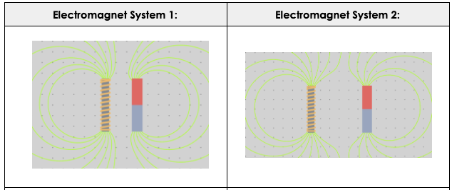 Both Electromagnet System 1 and Electromagnet System 2 are held in place before they are released. Before they are released, which system has more force? Explain.