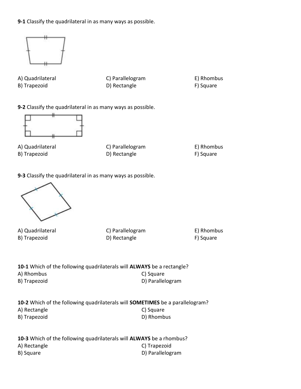 Questions 9-1 through 9-3(Your final answer should be separated by commas. EX: ABC,DEF,CAD)