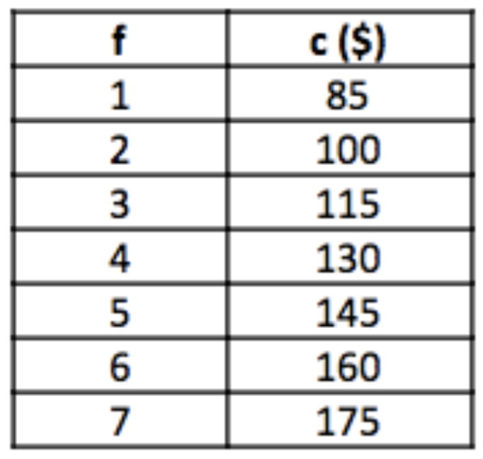 Shirish is taking friends to a roller blading park to celebrate his birthday. The cost of the celebration (c) is based on the number of friends that he invites (f) as shown in the table below. The cost includes the fee that it costs to have a party at the roller blading park.