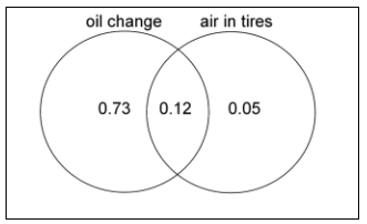 The Venn diagram shows the percentages of cars at Sam’s Garage that need an oil change or air in the tires.