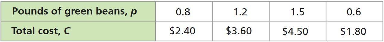 The price of green beans at a supermarket is shown in the table. Write an equation for the total cost C, in dollars, of p pounds of green beans.