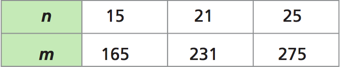 A car wash attendant counted the number of cars washed and the total amount of money earned. The company charged the same price for each car washed and earned $165 for 15 cars, $231 for 21 cars, and $275 for 25 cars. Write an equation for the relationship between the number of cars washed, n, and the number of dollars earned, m.