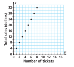 Write an equation that relates the total sales to the number of tickets sold. Use T for the total sales and n for the number of tickets. Escribe una ecuación que relacione las ventas totales con el número de entradas vendidas. Utiliza T para las ventas totales y n para el número de entradas.