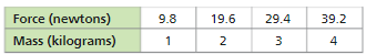 The table shows the relationship between the mass m and the force w of weights on the ground. La tabla muestra la relación entre la masa m y la fuerza w de las pesas en el suelo.