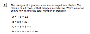 The oranges at a grocery store are arranged in a display. The display has 4 rows, with 8 oranges in each row. Which equation shows how to find the total number of oranges?