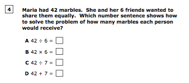 Maria had 42 marbles. She and her 6 friends wanted to share them equally. Which number sentence shows how to solve the problem of how many marbles each person would receive?