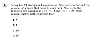 Jenny has 24 stamps in 4 equal packs. She wants to find out the number of stamps that come in each pack. She wrote the following two equations: 24 ÷ ? = 4 and ? × 4 = 24. What number makes both equations true?