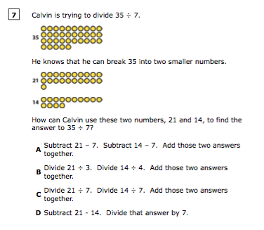 Calvin is trying to divide 35 ÷ 7.
