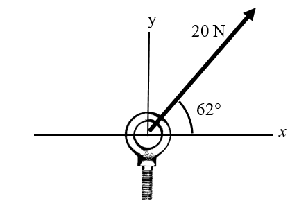 The two forces act on the eye bolt above. Determine the direction of the resultant force measured counter-clockwise from the positive x-axis.