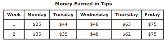 A waiter recorded the amount of money he earned in tips each week day for a two-week period. His data are shown in the table below. Which statement about the data in the table is true?