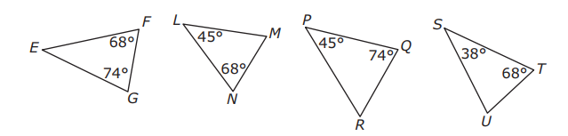 Four triangles and some of the angle measures are shown. Based on the angle easures, whcih of the following similarity statements is true?