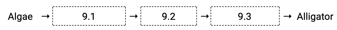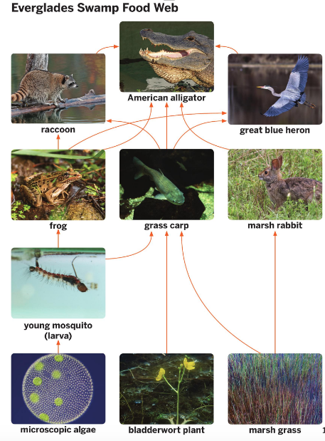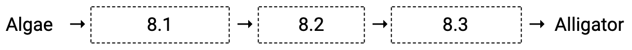 Start with the algae again, but this time, find a differentway up to the alligator. What eats what in this ecosystem?