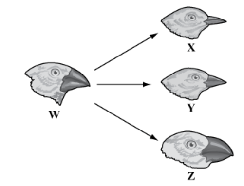 The diagram below shows four types of finches labeled W, X, Y, and Z. The type of finch labeled W adapted different traits over a long period of time that resulted in the three different types of finches labeled X, Y, and Z. What is the most likely reason the finches labeled X, Y, and Z adapted different traits from the finch labeled W?