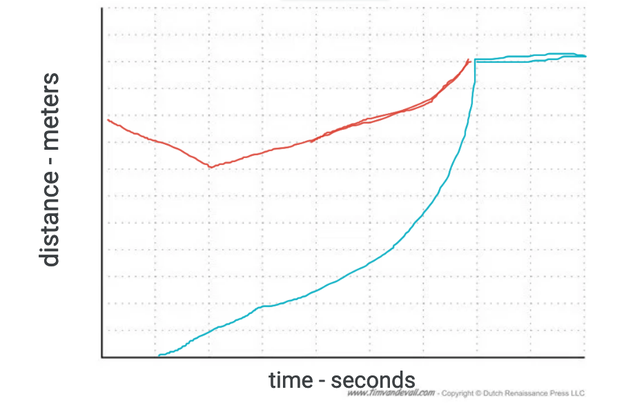 Put it all together. Here is a made-up time v. distance graph. The blue line shows one traveler and the red line a second. Explain what is taking place with as much detail as you can. Include the words "speed" "velocity" and "acceleration" in your story.