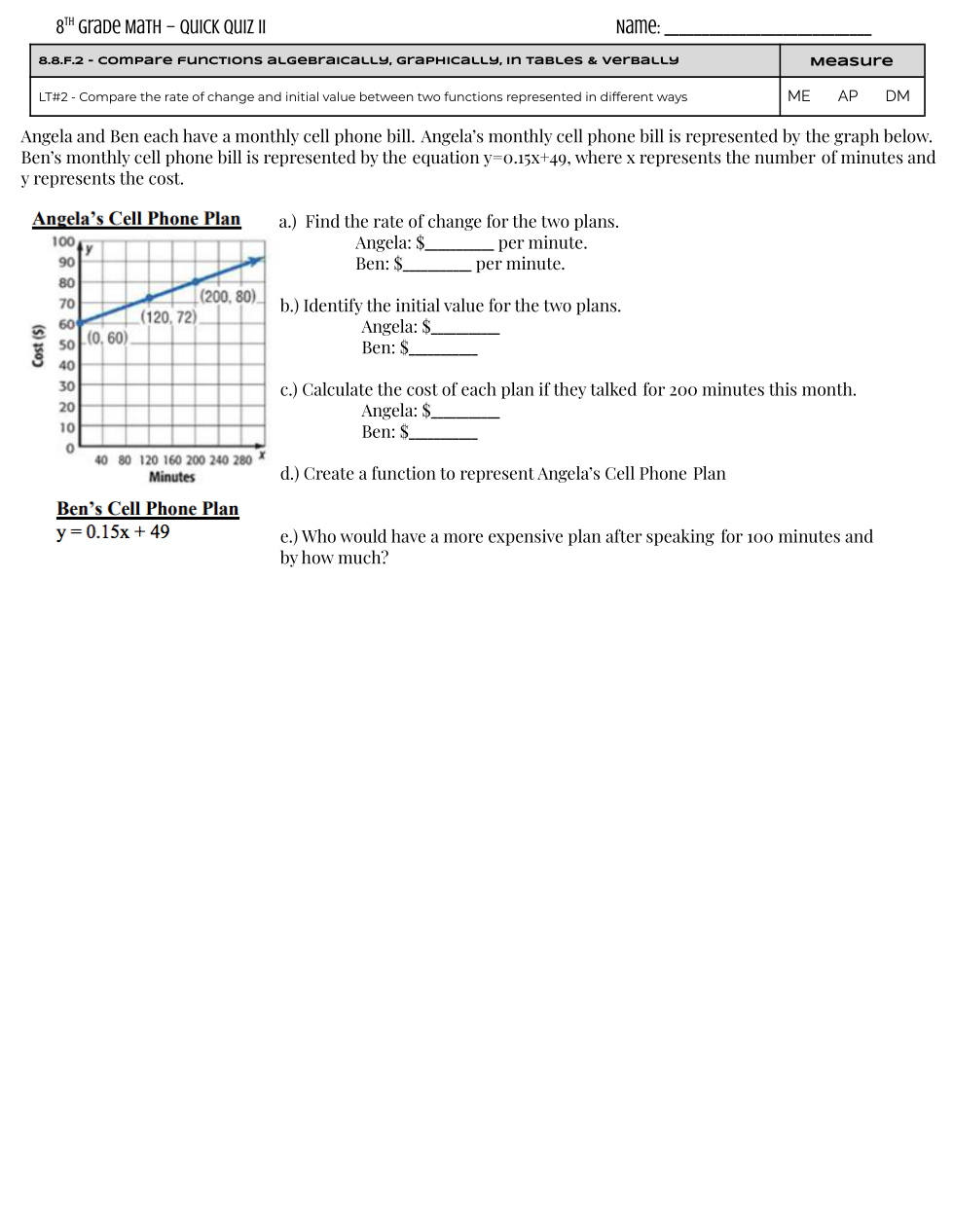 Angela & Ben each have a monthly cell phone bill. Angela's monthly cell phone bill is represented by the graph. Ben's monthly cell phone bill is represented by the equation y = 0.15x + 49, where x represents the number of minutes and y represents the cost.