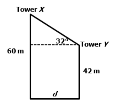 The angle of elevation of the top of Tower X from Tower Y is 32 degrees. If Tower X is 60 m tall, the Tower Y is 42 m tall, how far is the distance, d, between the base of Tower X and the base of Tower Y?
