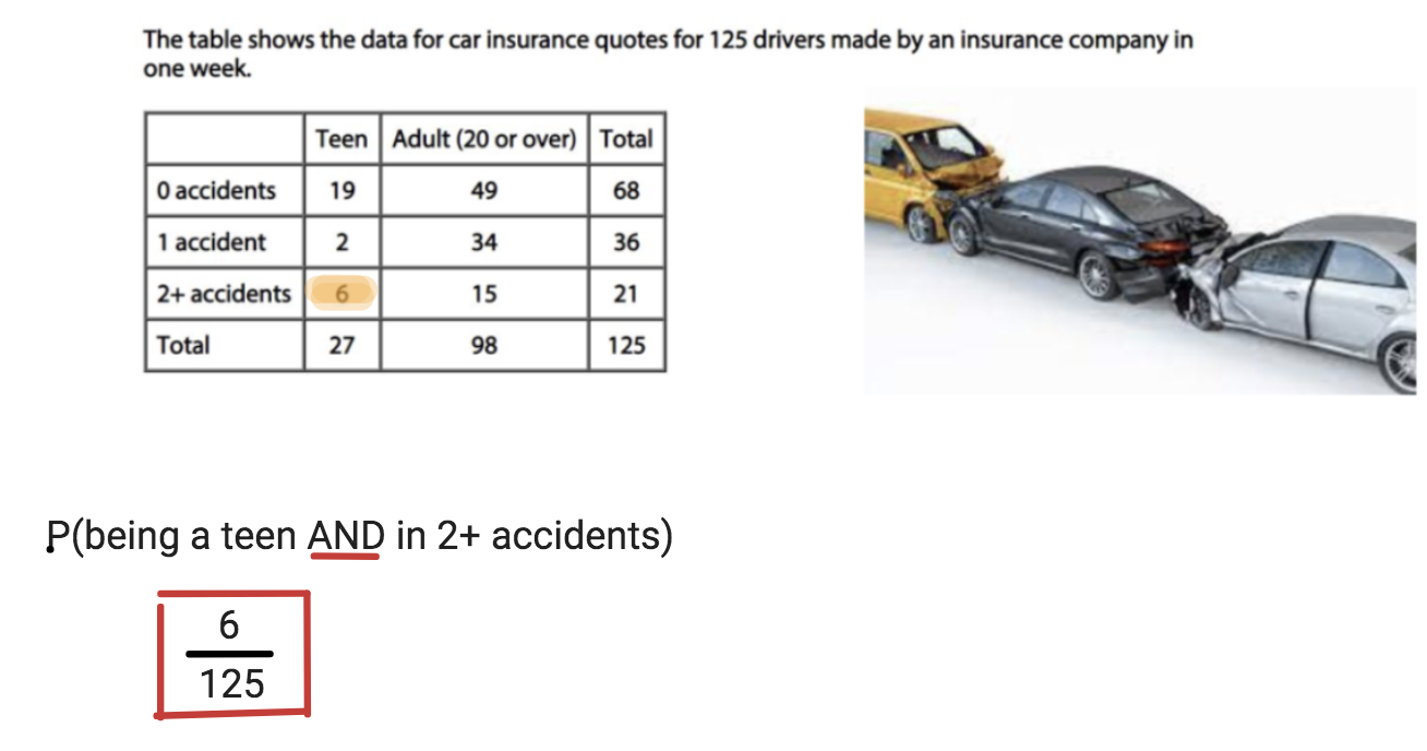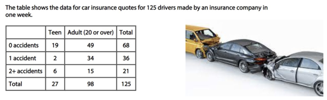 What is the probability that a driver has been in 2+ accidents OR is a teen?