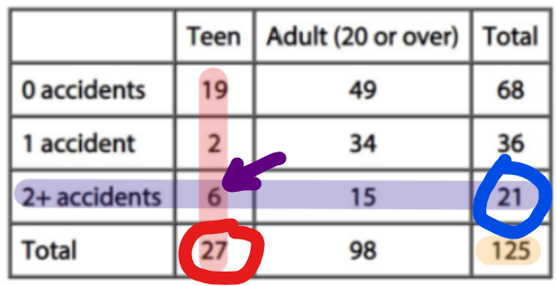 The probability that a driver picked at random is a teen would be 27/125.