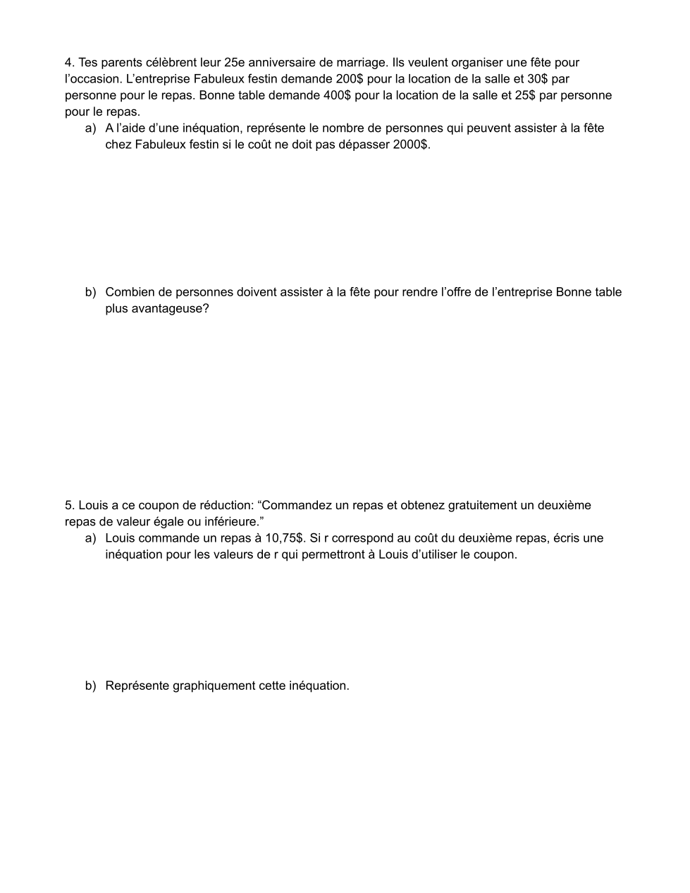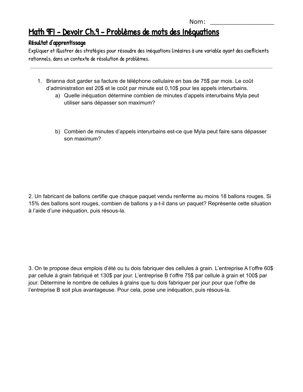 Math 9FI - Ch. 9 Devoir Problèmes de mots des inéquations