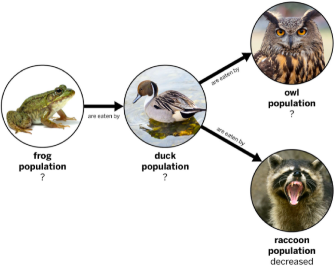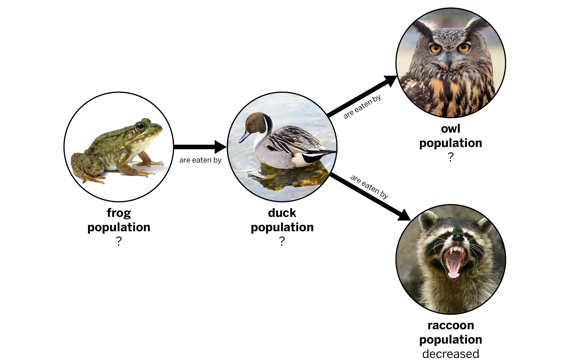 The data shows that recently the size of the raccoon population decreased. How will the decrease in the raccoon population affect the other populations? Be sure to explain whether the owl population, the duck population, and the frog population will change, and why.