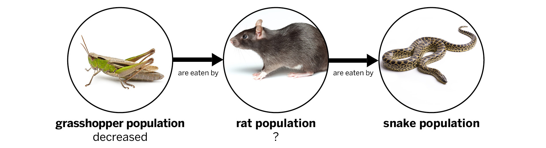 Scientists have been studying the size of three populations in a grassland. In this ecosystem, snakes eat rats, and rats eat grasshoppers. The data showed that all three populations were stable. Then the grasshopper population decreased suddenly. What will likely happen to the size of the rat population as a result?