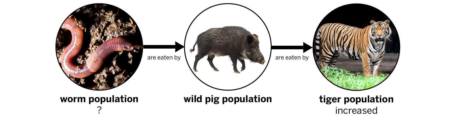 In a mountain region, tigers eat wild pigs, and wild pigs eat worms. In the last 5 years, the sizes of the populations have been stable, but recently the tiger population has increased. What will likely happen to the worm population?