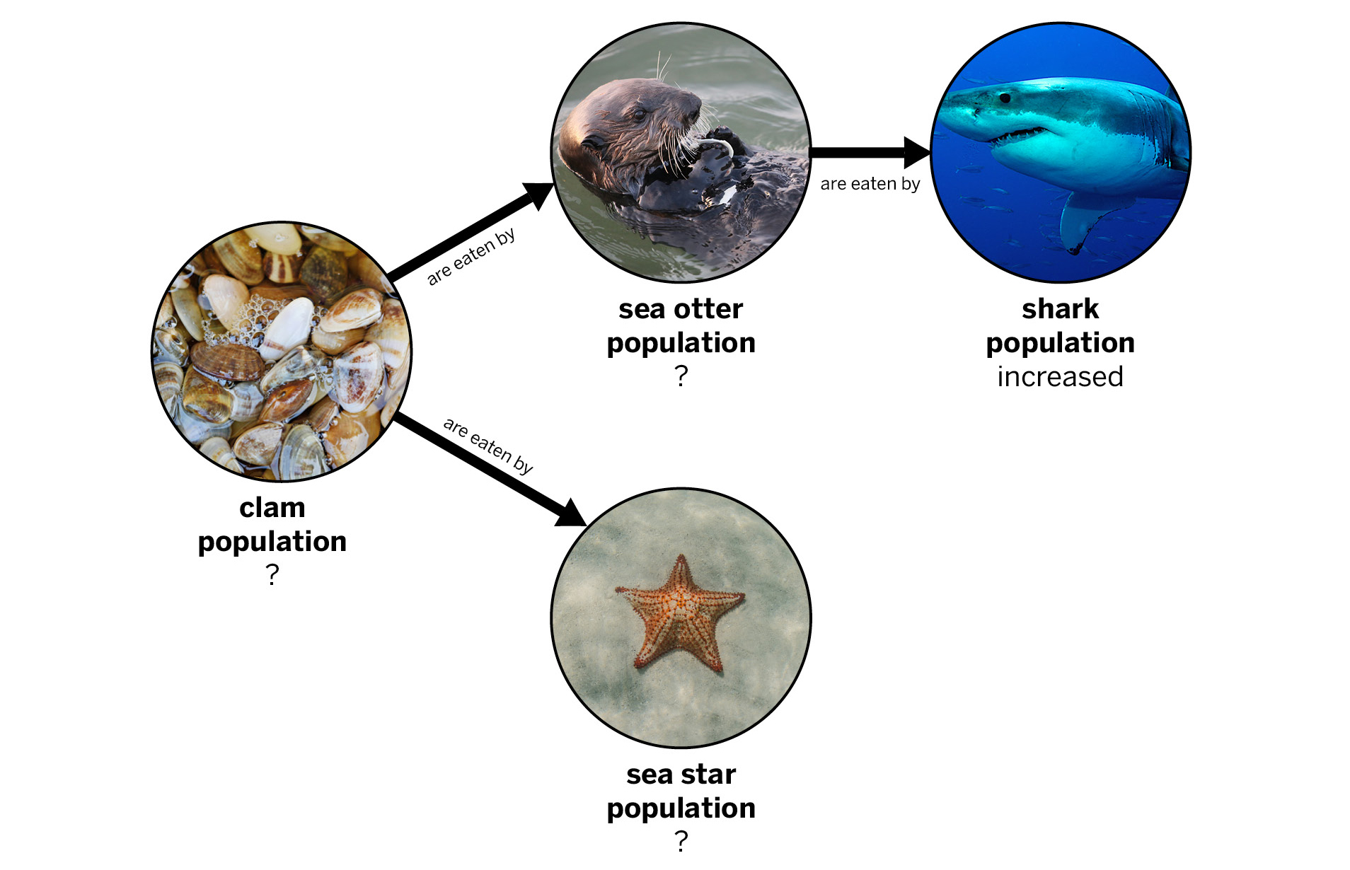 The data shows that recently the shark population increased. How will the increase in the shark population affect the other populations? Be sure to explain whether the sea otter population, the sea star population, and the clam population will change, and why.