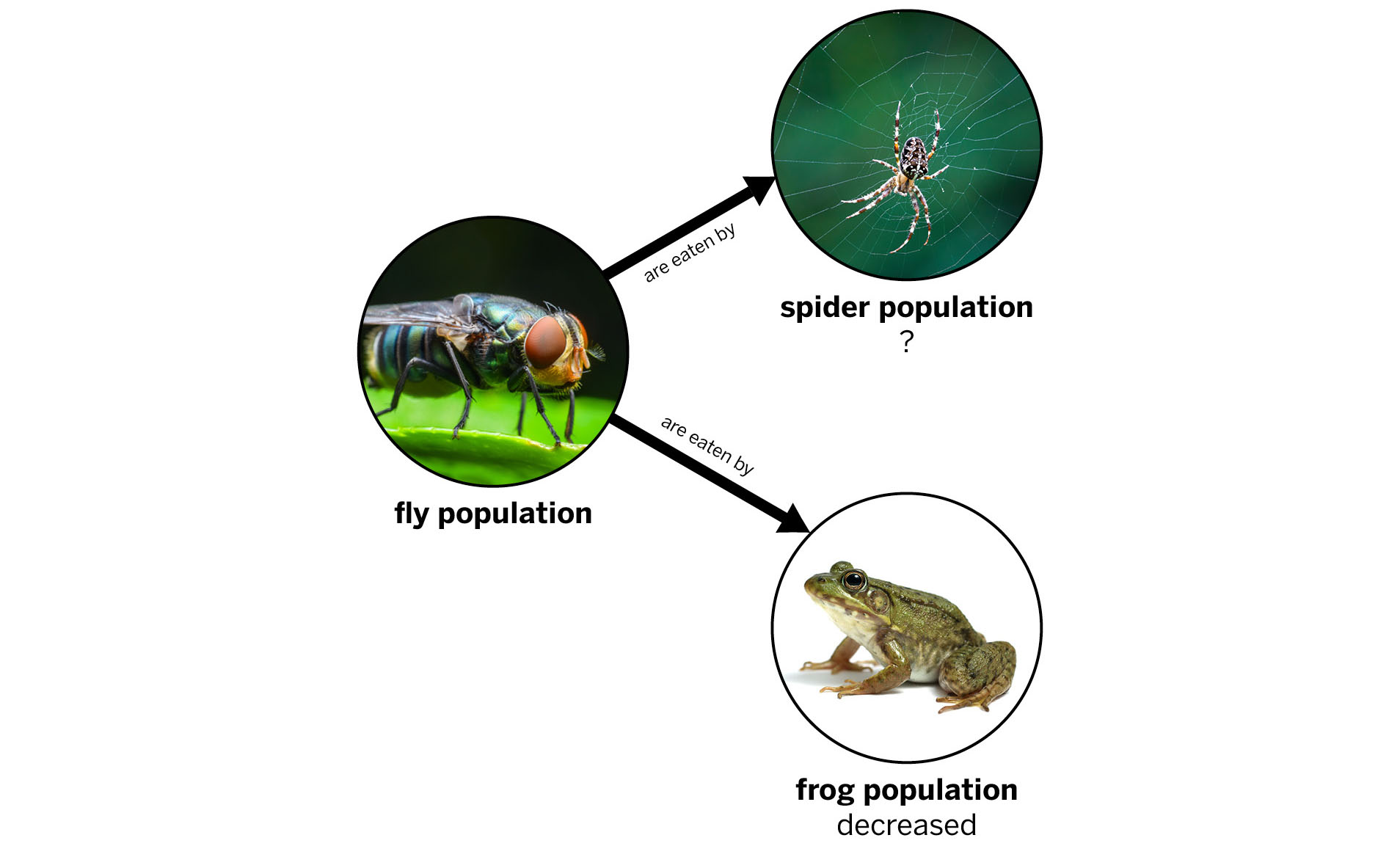 In a rainforest, both spiders and frogs eat flies. The sizes of the populations have been stable for the last 10 years, but recently the size of the frog population decreased. What will likely happen to the spider population?