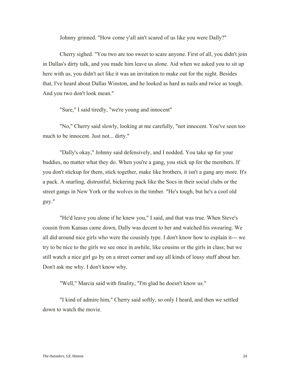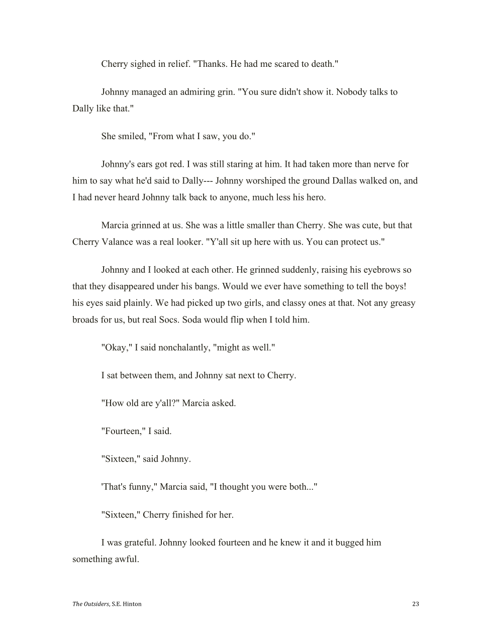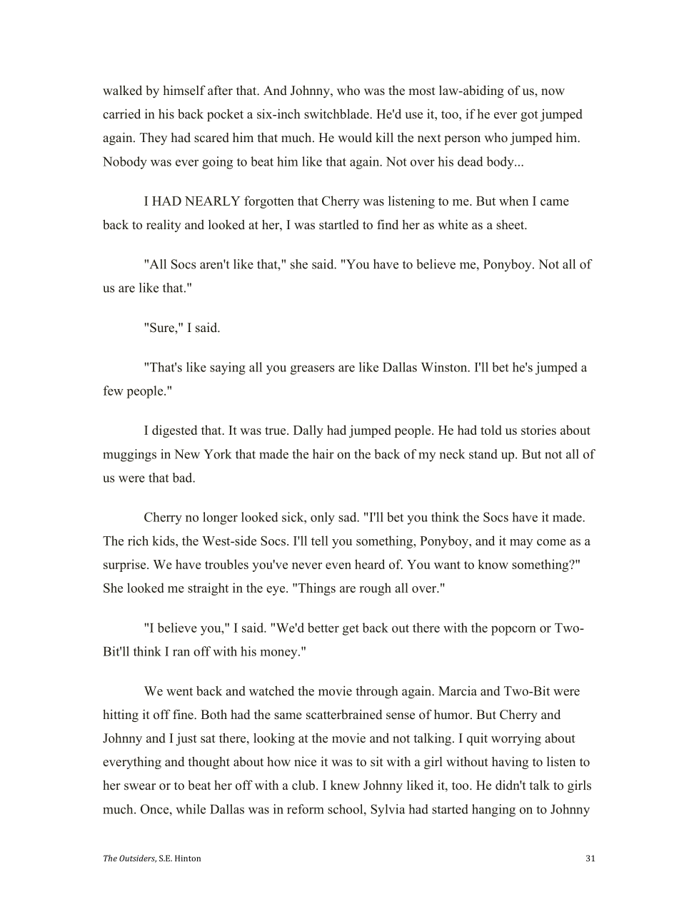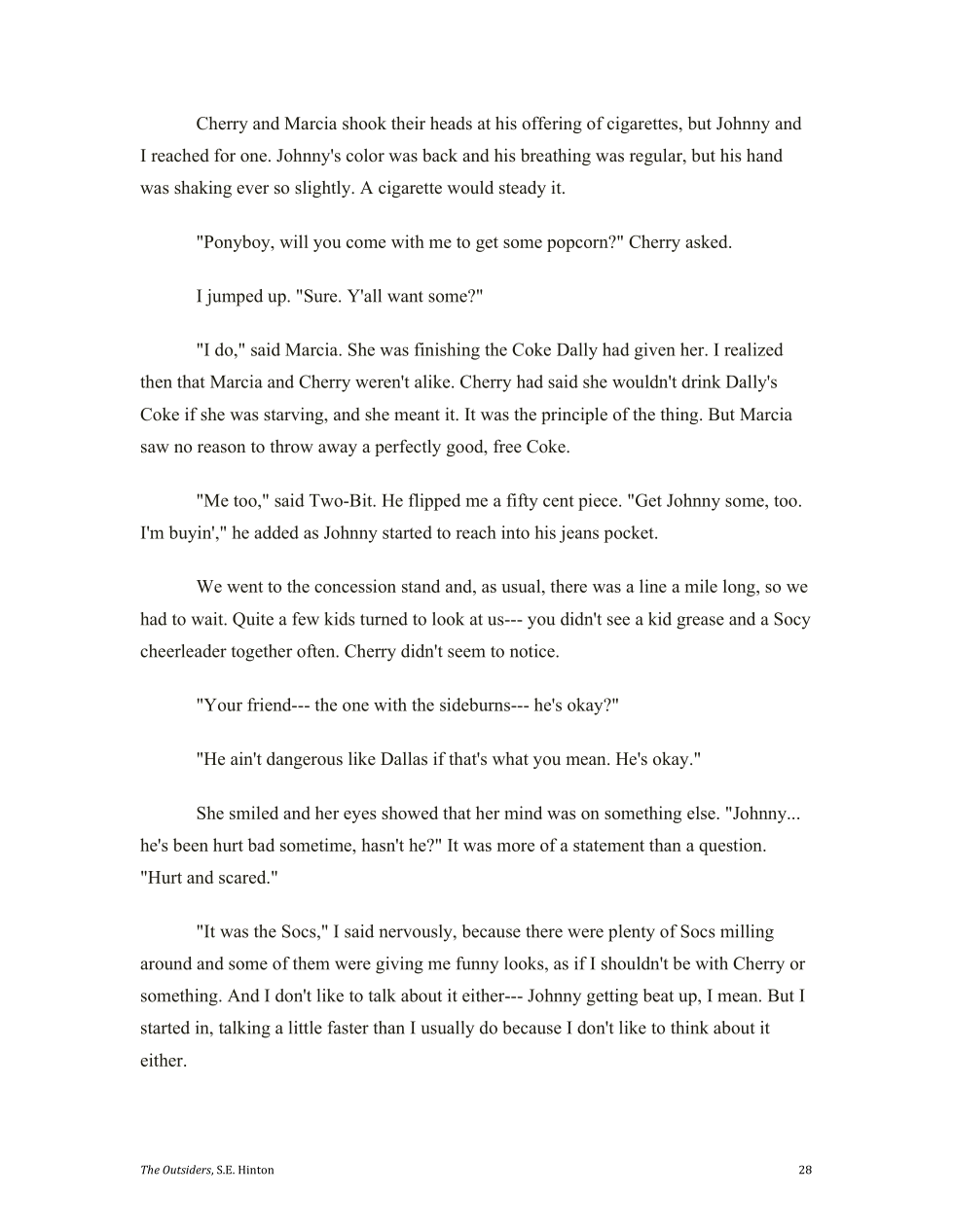 Cherry notices that Johnny really got messed up by the socs jumping him.