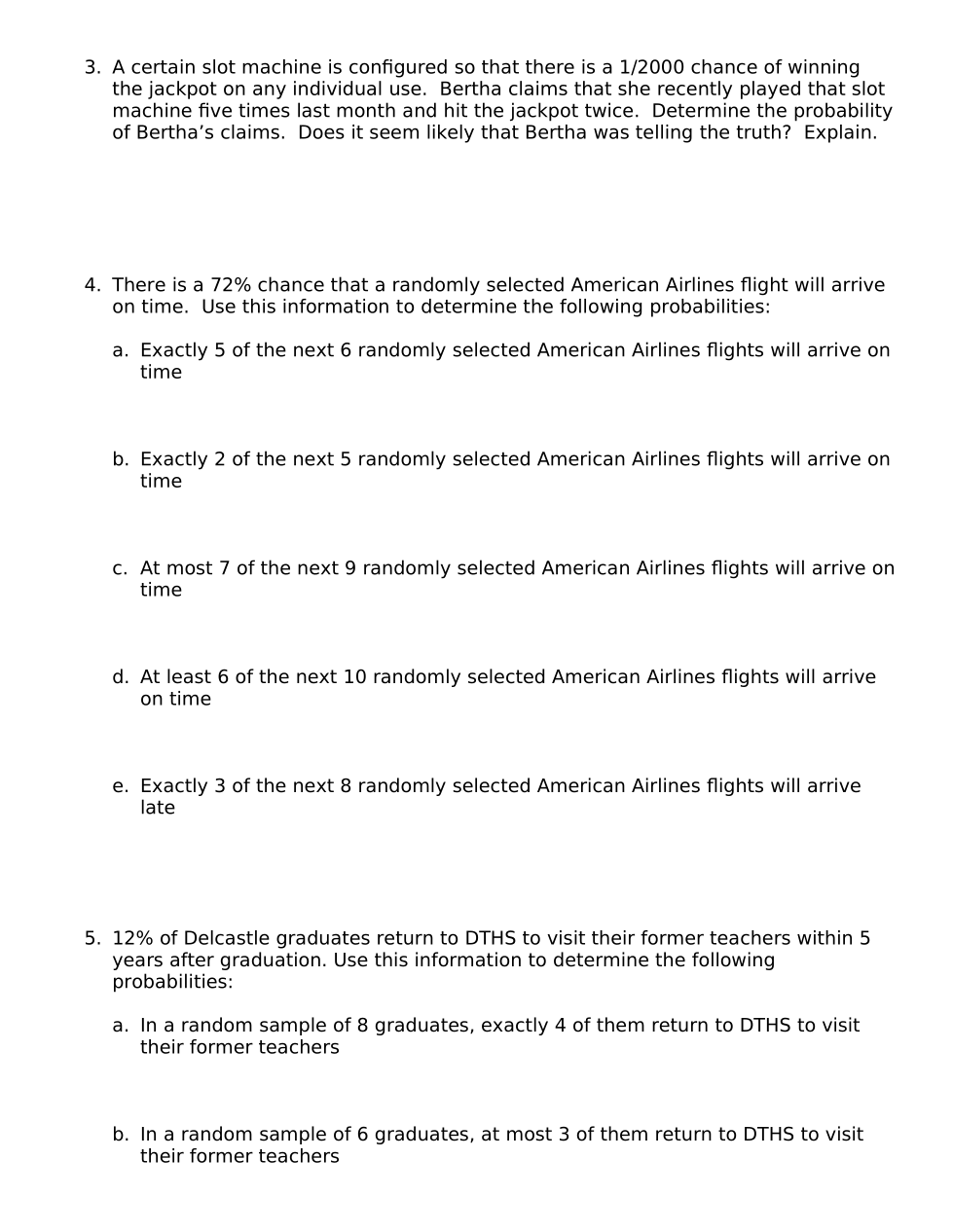 A certain slot machine is configured so that there is a 1/2000 chance of winning the jackpot on any individual use. Bertha claims that she recently played that slot machine five times last month and hit the jackpot twice.